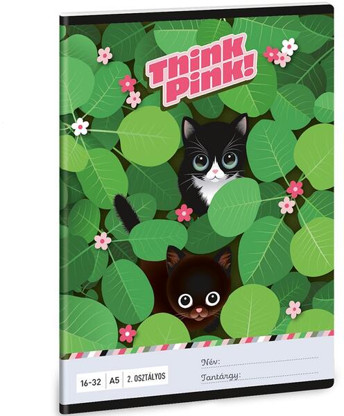 A Think Pink A/5 2. osztályos vonalas füzet tökéletes választás minden kisállatbarát és természetkedvelő kisiskolásnak, aki szereti a vidám, játékos mintákat. A borítón két cuki kiscica les ki a sűrű, zöld levelek közül, melyeket apró rózsaszín virágok díszítenek. A bájos dizájn barátságos hangulatot áraszt, és garantáltan mosolyt csal gyermeked arcára minden alkalommal, amikor előveszi a füzetét az iskolában vagy otthon.
