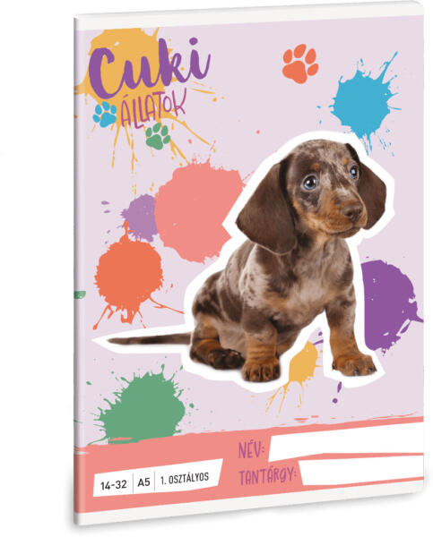 Cuki állatok tűzött füzet A/5, 32 lap vonalas 1. osztály (14-32), kutya, harlekin tacskó, 2025. A/5-ös méretű, vonalas füzet 1. osztályos szabványos vonalazással. 32 lapos, belseje 75 gr-os papírból. Borítója 250 gr-os műnyomó kartonra lekerekített sarkokkal, fényes fóliázással, 4 szín nyomással készült.