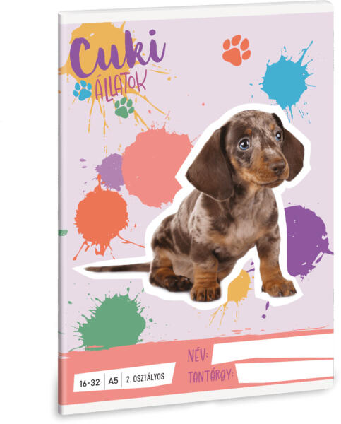 Cuki állatok tűzött füzet A/5, 32 lap vonalas 2. osztály (16-32), kutya, harlekin tacskó, 2025. A/5-ös méretű, vonalas füzet 2. osztályos szabványos vonalazással. 32 lapos, belseje 75 gr-os papírból. Borítója 250 gr-os műnyomó kartonra lekerekített sarkokkal, fényes fóliázással, 4 szín nyomással készült.