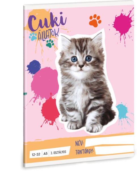 Cuki állatok tűzött füzet A/5, 32 lap vonalas 3. osztály (12-32), perzsa cica (macska), 2025. A/5-ös méretű, vonalas füzet 3. osztályos szabványos vonalazással. 32 lapos, belseje 75 gr-os papírból. Borítója 250 gr-os műnyomó kartonra lekerekített sarkokkal, fényes fóliázással, 4 szín nyomással készült.