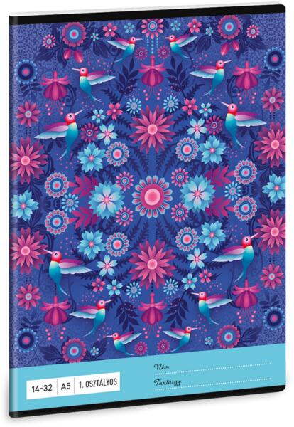 A/5-ös méretű, vonalas füzet 1. osztályos szabványos vonalazással. 32 lapos, belseje 75 gr-os papírból. Borítója 250 gr-os műnyomó kartonra lekerekített sarkokkal, fényes fóliázással, 4 szín nyomással készült.