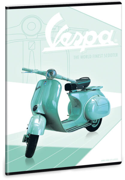 Vespa robogóval díszített A/4-es, prémium minőségű sima füzet. Belseje 40 lapos, 70 gr-os, fehér papírból, margózott oldalakkal, 300 gr-os borítóján fényes formalakkal.