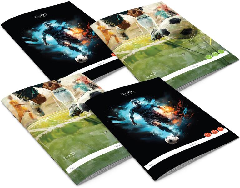 BiroCO jegyzetfüzet, A5 60 lap, Futball modell, 4 db/készlet A BiroCO A5-ös méretű, 60 oldalas, diktáló vonalakkal ellátott jegyzetfüzet tökéletes iskolai és oktatási tevékenységekhez. A borító 350 g/m2-es fényes kartonból készült, amely tartósságot és kopásállóságot biztosít. A belső rész 60 g/m2 fehér papírt tartalmaz, amely ideális a tiszta és rendezett íráshoz. Tűzött formátum, könnyen használható, otthoni és iskolai használatra egyaránt alkalmas. Fényes kartonborítás 350 g/m2