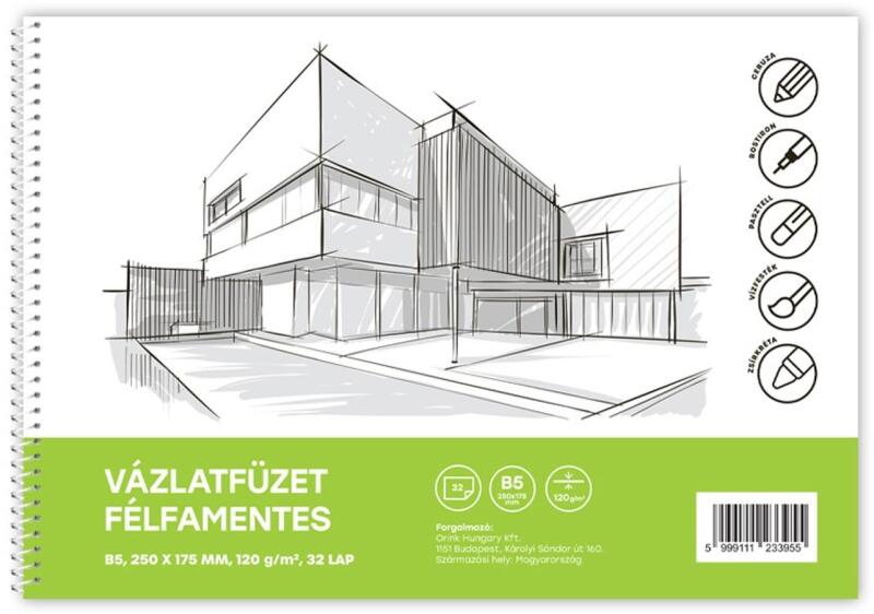 Rajz, festészet és iskolai használatra. Mivel a vázlatfüzet spirálos kialakítású és a lapok egymáson vannak, így vizes festésnél különös figyelmet igényel.  Hiteles tájékoztatás: Elkötelezettek vagyunk termékeink biztonságának garantálásáért, nyomon követjük a termékbiztonsággal kapcsolatos valamennyi európai uniós és hazai szabályozást és biztosítjuk termékeink azoknak történő megfelelését. Az EU 2023/988-as számú Általános Termékbiztonsági Rendeletét (GPSR) is alkalmazzuk, így ha a termékeink biztonságát illetően fogyasztóként kérdése, észrevétele van, vagy esetleg balesetről van tudomása, kérjük, írja meg nekünk. GPSR: Orink Hungary Kft. ;H-1151 Budapest, Károlyi Sándor út 160. ; info@orinkhungary. hu; https://orink. hu/