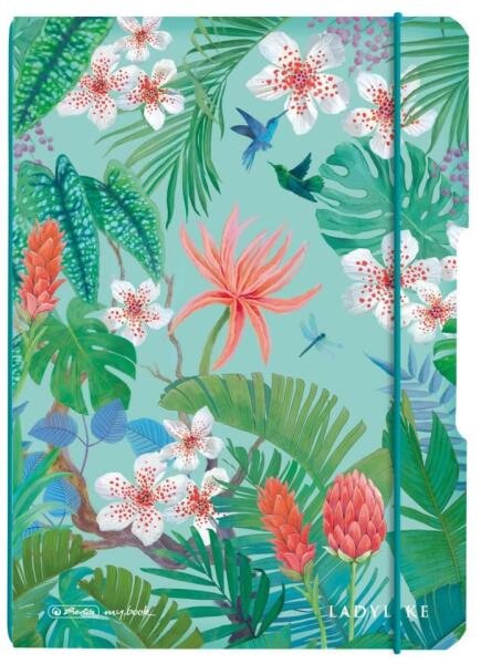 my. book flex füzet Ladylike Jungle, A5-ös méretben, 80g/m2 famentes belívvel, hófehér, ponthálós lapokkal, lekerekített sarkokkal, hosszanti irányban gumiszalaggal záródik, PP fedlappal.