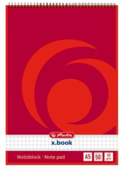 A5-ös méretű 50 lapos felül spirálozott jegyzetblokk, 60g/m2-es famentes, kockás belívvel, az x. book termékcsalád része.