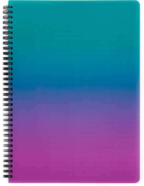 Spirál füzet A/4, vonalas, 60 lapos, műanyag borítóval, OMBRE, türkiz-rózsaszín. Perforált lapok. Méret: 225x300x8mm. Lapok: 70g/m2. Borító anyaga: polypropylen.
