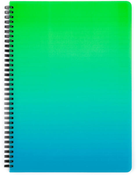 Spirál füzet A/4, vonalas, 60 lapos, műanyag borítóval, OMBRE, zöld-kék. Perforált lapok. Méret: 225x300x8mm. Lapok: 70g/m2. Borító anyaga: polypropylen.