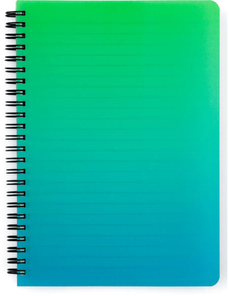 Spirál füzet A/5, vonalas, 60 lapos, műanyag borítóval, OMBRE, zöld-kék. Perforált lapok. Méret: 165x215x8mm. Borító anyaga PVC.