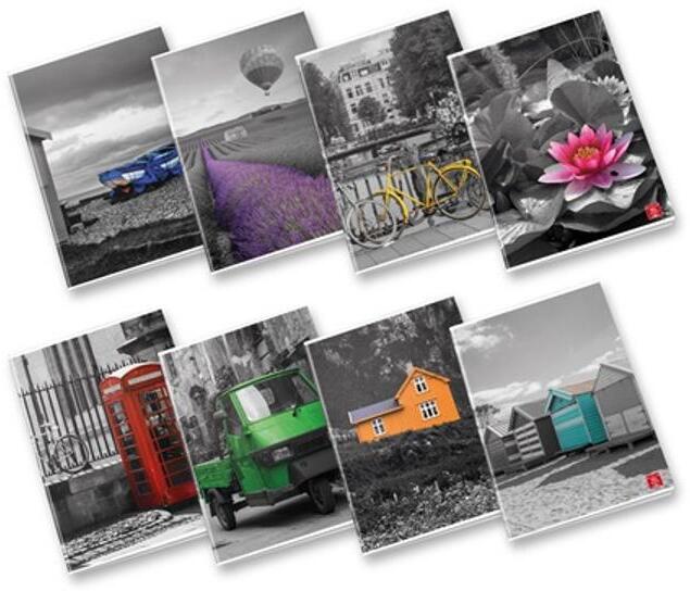 • A Touch of Color füzetek egyedi borítóin fekete-fehér fotók jelennek meg élénk színkiemeléssel, így különleges vizuális élményt nyújtanak