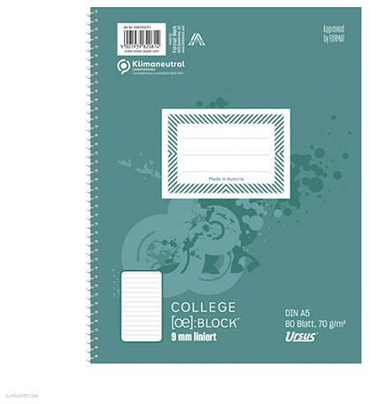 Az Ursus Collegeblock A5 -ös vonalas spirálfüzet, merev fedlappal, fémspirállal. A lapok lyukasztott ak és mikroperforáció val rendelkeznek a könnyű eltávolítás és iktatás érdekében. Minden jegyzettömb 80 lap ot tartalmaz minőségi fehér ECF-papírból, szögletes sarkokkal. Magas fehérségű, teljesen klórmentes, klímasemlegesen előállított, környezetbarát papírból. Méret: A5 . Lapszám: 80 . Típus: vonalas . Lyukasztás: 4 darab .